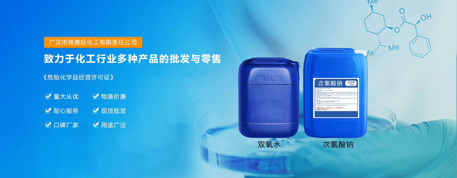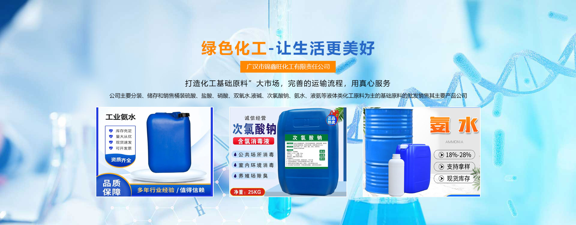 广汉市锦鑫旺化工有限责任公司地处广汉市汉州街道工业园区,距省会成都28km;成都二绕、G5京昆高速穿境而过,交通便利、信息快捷、经济发达。公司主要分装、储存和销售桶装硫酸、盐酸、硝酸、双氧水.液碱、次氯酸钠、氨水、液氨等液体类化工原料为主的基础原料的批发销售其主要产品公司。有2.5L/桶、25L/桶200L/桶、吨桶等各类包装规格,也可根据客户需求定制不同规格的包装。根据产品用途和纯度级别不同有:工业级、试剂级、食品级、电子级。我司是一家集生产、研发、分装、仓储、销售、运输于一体的科技型企业。